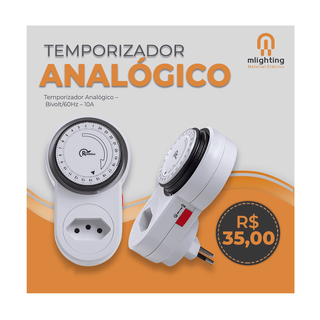 Este modelo possui inúmeras programações, porem com intervalos de 15 em 15 minutos para a programação do desligamento, ele é o mais indicado para ser usado em ambientes úmidos, como em motor de piscina, poços artesianos e bombas de água, por dispor de um sistema operado mecanicamente, possui maior resistência a este tipo de ambiente comparado com o modelo digital. Em questões de custo, o temporizador analógico, é mais acessível para a aquisição, ele é de fácil manuseio e pode ser ligado diretamente à tomada elétrica.